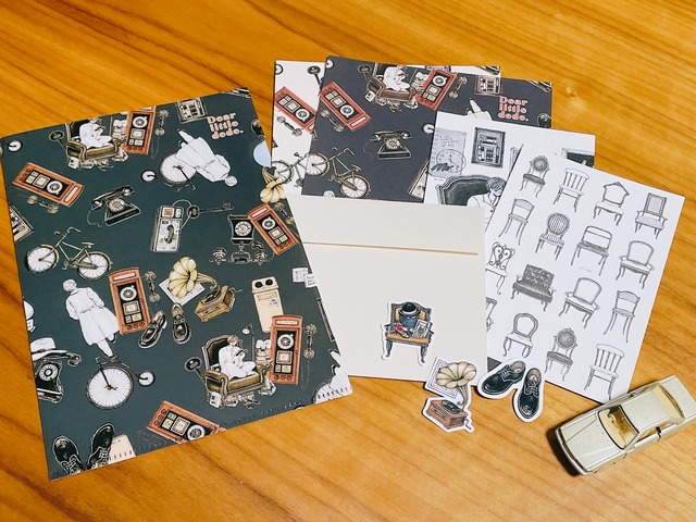 「懐かしいものに囲まれる時間」 アンティーク雑貨をモチーフにした線画イラストがステーショナリーになりました。 便箋と封筒は、落ち着いたネイビーとアイボリーの2色入です。 色々なグッズがセットになったステーショナリーは何歳になってもわくわくするもので、Dear little dede.でも作ってみました。 ① A5サイズのクリアファイル ② 便箋... 8枚 ③ 封筒... 3枚 ④ ポストカード... 2枚 ( 2種 ) ⑤ ステッカー ... 3枚 ( ランダム ) が入っています。