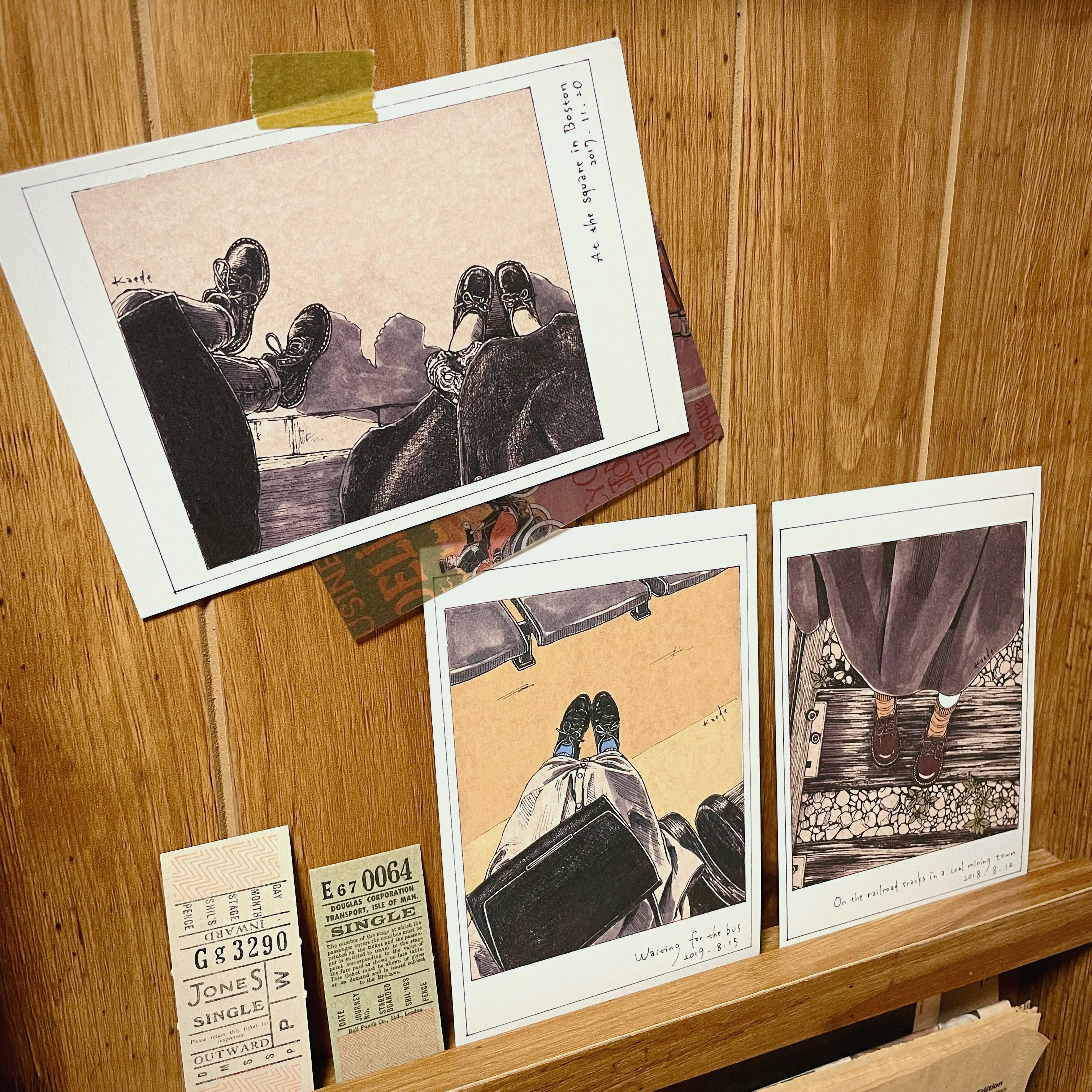ある日どこかで撮影した一場面、をモチーフにしたオリジナル線画イラストシリーズ「 That day, I was here.」の中から数種類がポストカードになりました。